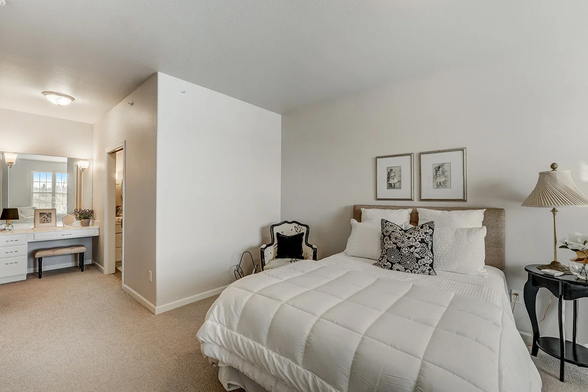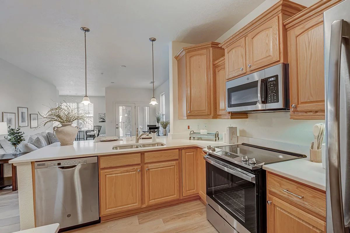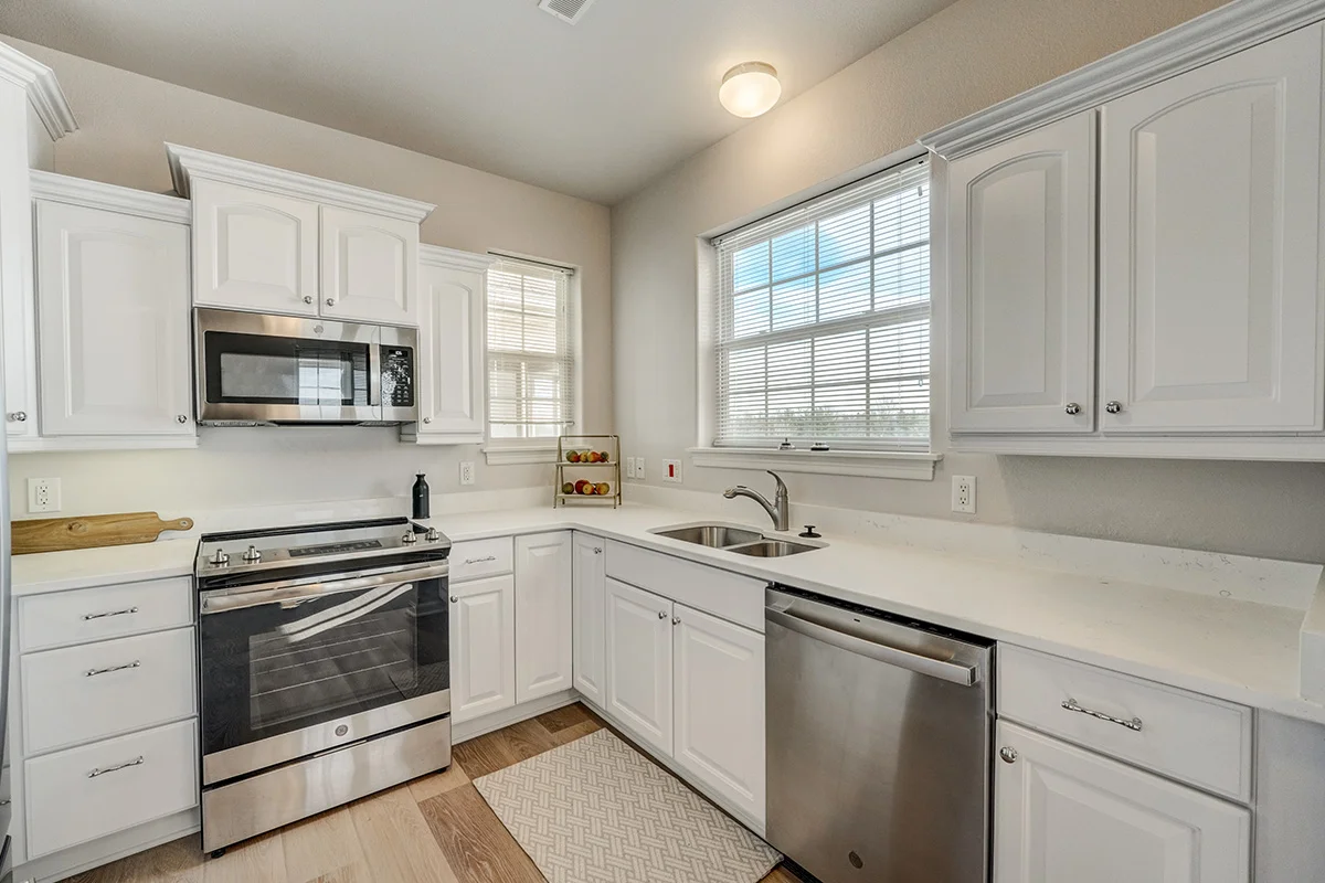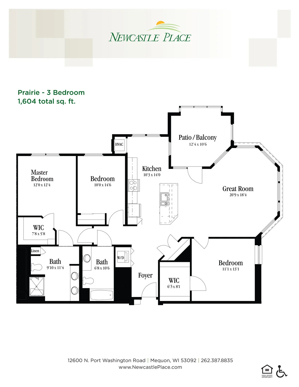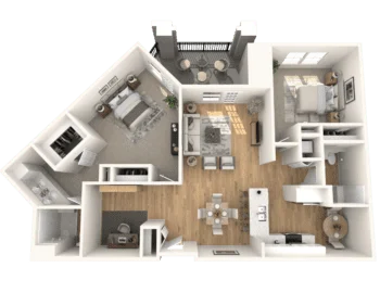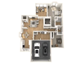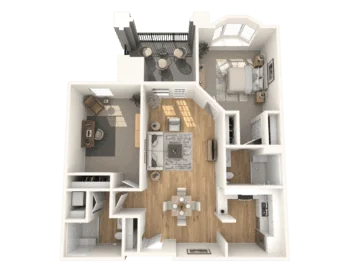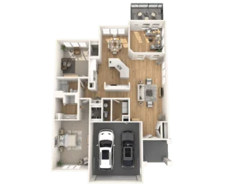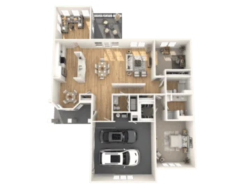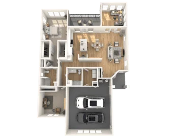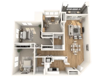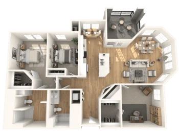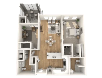 The largest three-bedroom apartment that we offer, the Prairie, has a spacious, open floor plan. It features a large kitchen and a great room that has plenty of natural light. Enjoy a meal at your large kitchen island, in the intimate dining area, or on the patio. The primary and secondary bedrooms are complete with their own walk-in closets, and the third bedroom has ample closet space. Both bathrooms are hall-accessible, the primary bedroom features two sinks and a linen closet for more storage.