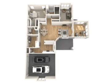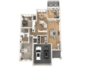 The Cedar Carriage Home features a cozy front porch. After entering through the foyer, you are welcomed into a modern floor plan with plenty of useful nooks and storage space. Enjoy a book or check in with family online at your built-in desk or out in your four-season sun room or patio. The main bedroom boasts two walk-in closets, two nearby linen closets, and a full bathroom. The secondary bedroom has plenty of closet space and a hall-accessible full bath. Easily access the two-car garage through the laundry room.