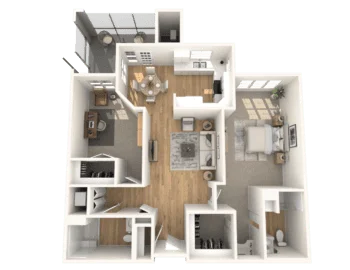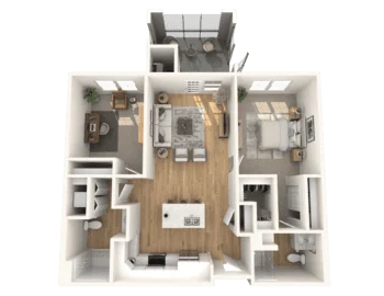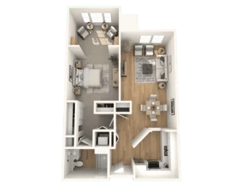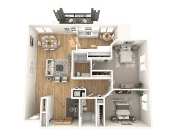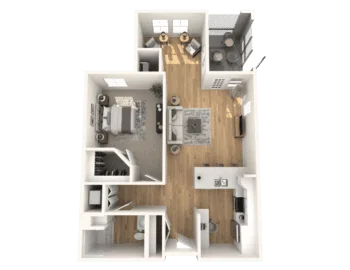 The Oriole features a modern, open floor plan with an intimate kitchen area that offers plenty of natural light. The main bedroom is complete with a pass-through closet and a full bathroom. The secondary bedroom has its own closet space and hall-accessible full bath. This floor plan also features a cozy den alcove that’s the perfect space to enjoy your favorite pastimes.
