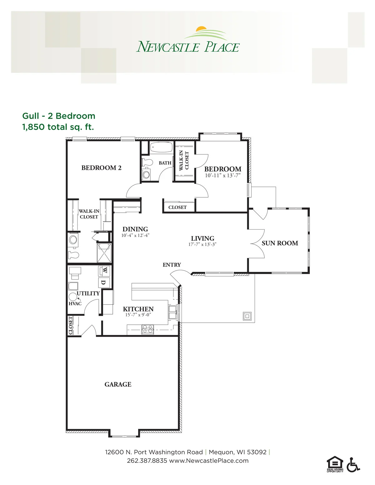Call today for a tour! This two-bedroom Carriage Home is a great fit if you’re looking for a modern floor plan. Enjoy a generous living and dining area, with a wide-open kitchen — the perfect combination for hosting. Sip a cool drink and relax in your spacious sun room. Both bedrooms have their own walk-in closets and dedicated bathrooms. The Gull also offers an attached garage, utility room, laundry area, and plenty of storage space.