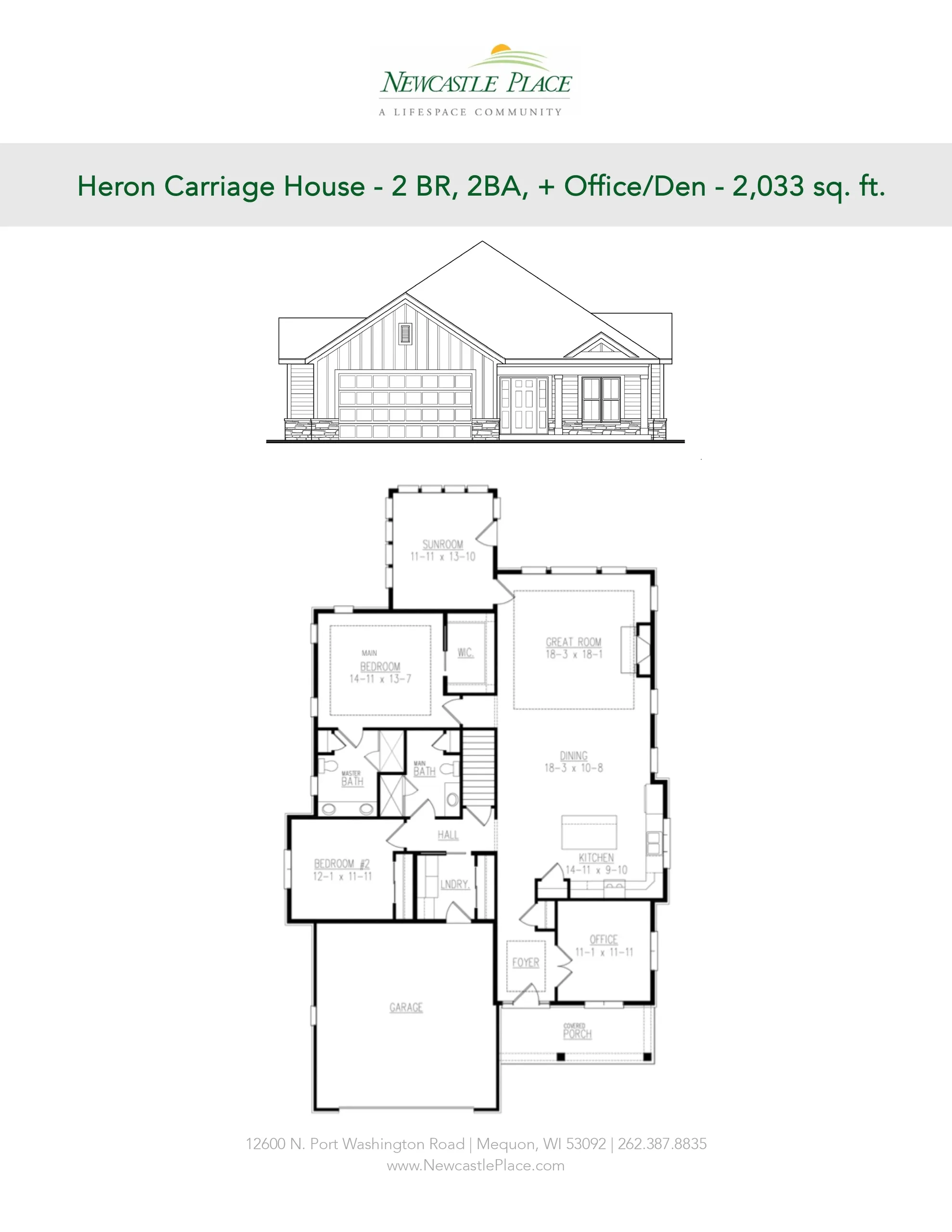 The Heron offers open-concept living with a spacious great room, bright sunroom, private main suite, guest bedroom, office, and two-car garage—all on one easy, maintenance-free level. Inquire today! Construction begins July 14 and is expected to be completed by Fall 2026.